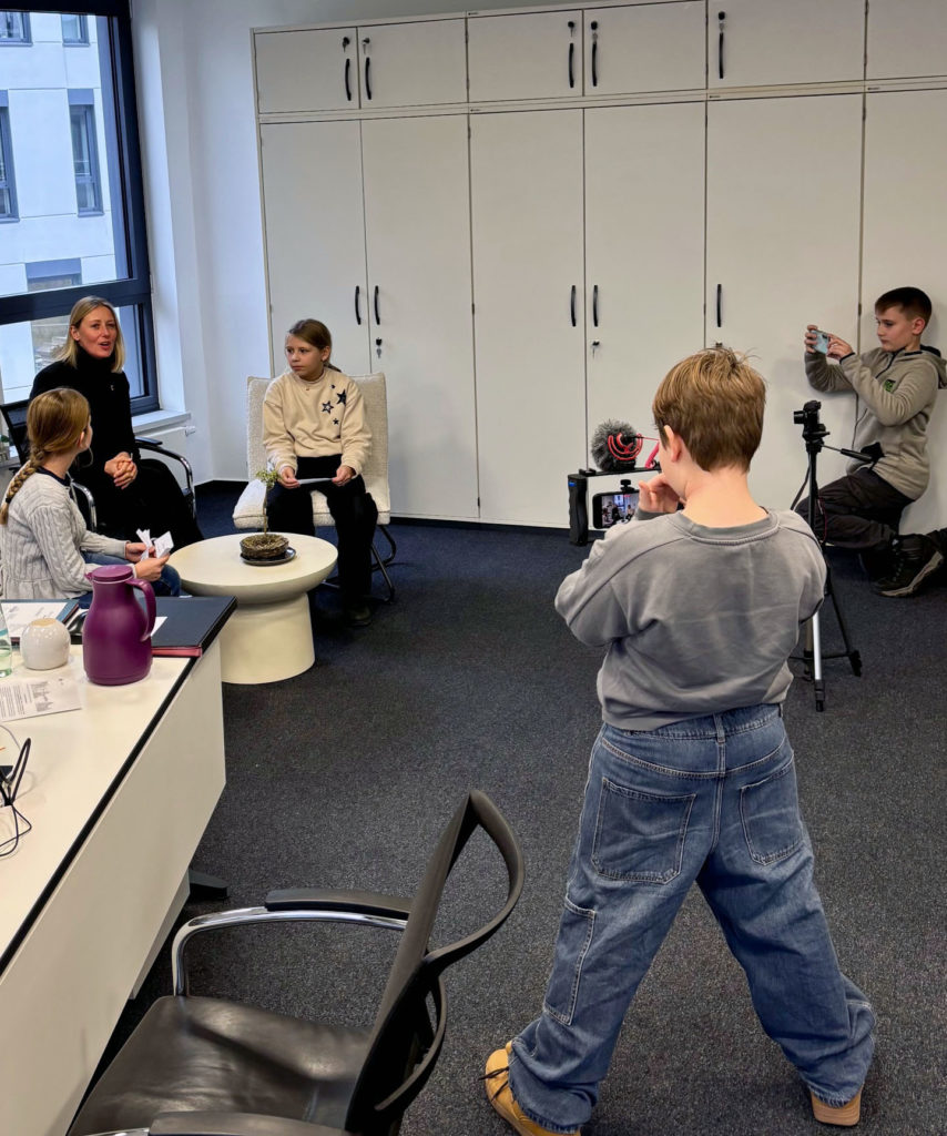 Sie entwickeln eigene Kinder- und Jugendnews – von der Themenrecherche bis zur Umsetzung. Im Rathaus stellten sie der Verwaltungschefin Fragen zu ganz unterschiedlichen Bereichen: ihrer Arbeit, Umwelt- und Sportthemen, zur Sanierung der Schulsporthalle, aber auch zu persönlichen Vorlieben wie Lieblingsessen oder dem passenden Emoji. „Ich gespannt auf euren Beitrag und drücke die Daumen, dass ihr beim Wettbewerb erfolgreich seid“, sagte Bürgermeister Zupancic.