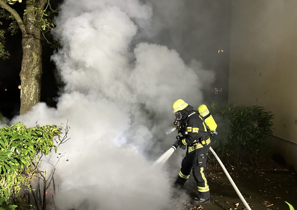 In Moers-Repelen brannten am Dongratshof mehrere Müllbehälter direkt an einer Hausfassade. Ein Übergreifen der Flammen konnte verhindert werden, dennoch musste die Fassade mit Außendämmung teilweise geöffnet und abgelöscht werden.