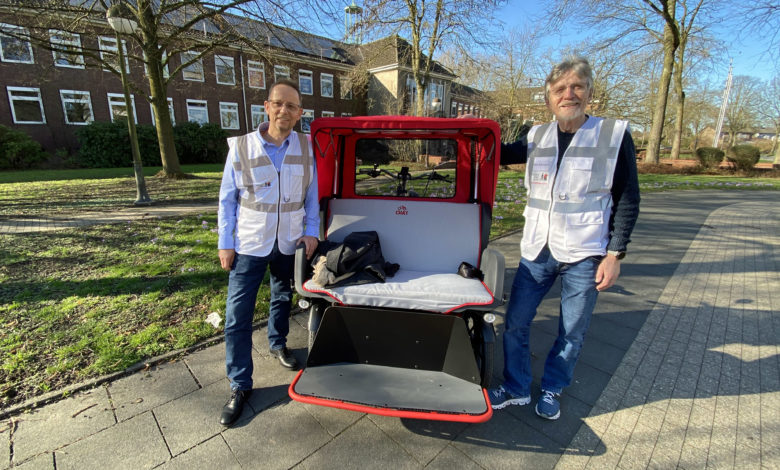 Bildzeile: Willi Ehrmann (r.) schult Bürgermeister Dirk Schauenberg (l.) als Rikscha-Pilot.