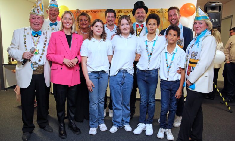 Moers. (pst) Laut, fröhlich und bunt war es Donnerstag, 13. November, im Rathaus. Bürgermeisterin Julia Zupancic hatte die designierten Prinzenpaare und das scheidende Prinzenpaar eingeladen, um sich in das Goldene Buch der Stadt einzutragen. Dabei waren auch Vertreterinnen und Vertreter der Grafschafter Karnevalsvereine sowie Vorstandsmitglieder des Kulturausschusses Grafschafter Karneval (KGK). Die Narrenschar regiert in der Session 2025/2026 Bastian I. und Steffen I. als erstes gleichgeschlechtliches Prinzenpaar in Moers. Das neue Kinderprinzenpaar heißt Quentin I. und Samantha I. In den karnevalistischen Ruhestand wurde Pascal I. und Elsa I. „Es ist klar, dass Vielfalt gefeiert wird – einKernthema des Karnevals“, erklärte Bürgermeisterin Zupancic in ihrer Begrüßungsrede. Sie bedankte sich beim neuen Prinzenpaar und den anderen Karnevalistinnen und Karnevalisten für ihr ehrenamtliches Engagement. Die Verwaltungschefin bat die Gäste allerdings augenzwinkernd darum, kein Konfetti im Rathaus zu werfen, da dort jedes eingehende Papierstück mit einem Stempel versehen und später digitalisiert werden muss.