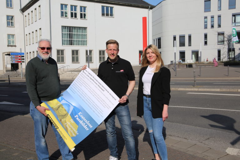 Bildzeile: Klaus Fabritz (Inhaber Fotostudio Fabritz), Martin Barth (Inhaber Fotostudio Barth) und Julia Cestnik (Leiterin der Ausländerbehörde) werben für kostenlose Passbilder für ukrainische Flüchtlinge.