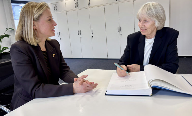 Moers. (pst) Vom Bolzplatz zur Geschichte des deutschen Fußballs: Anne Trabant-Haarbach ist seit Mitte März im Goldenen Buch der Stadt verewigt. Bürgermeisterin Julia Zupancic würdigte damit ihre außergewöhnlichen Verdienste. Anlass war die Verleihung des Verdienstordens der Bundesrepublik Deutschland. Diesen hat die 77-Jährige Mitte Januar erhalten. Seit 2018 lebt sie in Moers.