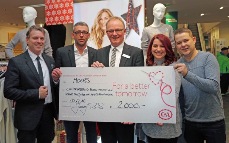 Bereits zum wiederholten Mal engagiert sich C&A Deutschland im Rahmen seiner Weihnachtsspendenaktion für Kinder und Familien in Deutschland mit einer Million Euro. Auch Moers profitiert davon schon seit vielen Jahren. Als Familienunternehmen in sechster Generation ist sich C&A seiner gesellschaftlichen Verantwortung bewusst und ruft dazu auf, die Weihnachtszeit auch dafür zu nutzen, einen Moment inne zu halten und an die Menschen zu denken, die Unterstützung benötigen. Die C&A Foundation stellt für diesen Zweck der Filiale in Moers 2.000 Euro für ein Sozialprojekt ihrer Wahl zur Verfügung. Den einzelnen Filialen überlässt C&A dabei ganz bewusst die Auswahl und Koordination eines passenden Projektes. „Als Mitarbeiter von C&A stehen wir täglich im direkten Kundenkontakt und kennen die Bedürfnisse der Menschen vor Ort am besten. Daher ist es für uns eine besondere Freude, dass wir den Caritasverband Moers–Xanten e.V. Träger für Jugendhilfe/Einrichtungen mit unserer Spende unterstützen können und die Hilfe direkt den Menschen in unserer Mitte zugutekommt“, erklärt Josef Bils, Storemanger der C&A-Filiale in Moers.