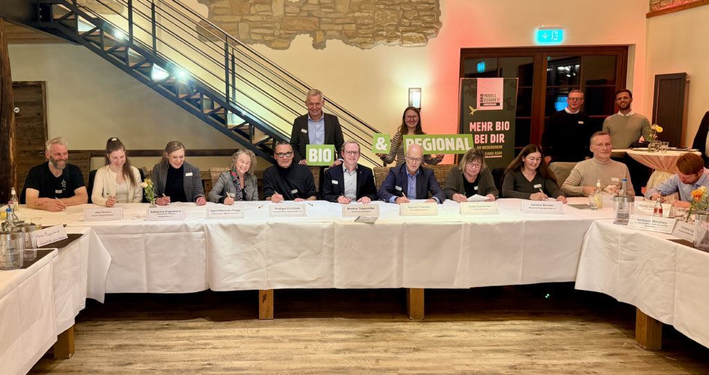Auf Initiative der Öko-Modellregion Niederrhein wurde am Mittwoch, 19. November 2025, ein Partnerschaftsbündnis für den Ökolandbau am Niederrhein gegründet. Bei der Gründungsveranstaltung im Landgut am Hochwald in Sonsbeck kamen rund 40 Teilnehmende aus Landwirtschaft, Wirtschaft, Verwaltung, Bildung, Kultur, Tourismus, Gesundheit, Finanzen und Zivilgesellschaft zusammen. Sie alle eint das gemeinsame Ziel, den ökologischen Landbau am Niederrheinzu stärken und regionale Bio-Wertschöpfungsketten weiter auszubauen. Das Partnerschaftsbündnis soll die vielfältigen Akteure enger vernetzen, gemeinsame Projekte ermöglichen und das Bewusstsein für nachhaltige Ernährung, Klima- und Umweltschutz in der Region sichtbar fördern. Damit entsteht ein starkes Netzwerk, das die Zukunftsfähigkeit des Niederrheins aktiv mitgestaltet.