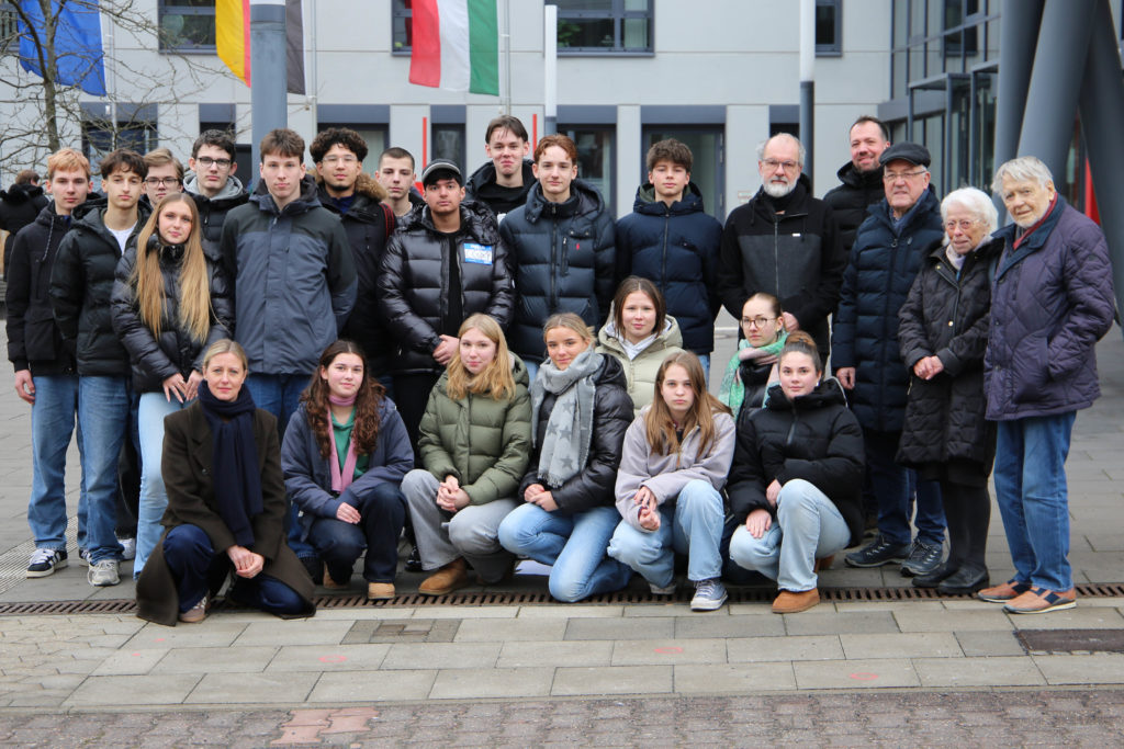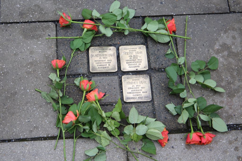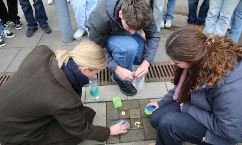Die Schülerinnen und Schüler trugen an dem Mittag die Lebensläufe der Familie Bähr vor, deren Stolpersteine am Rathausplatz zu finden sind. Sie wurden damals in das Ghetto Theresienstadt und später in das Konzentrationslager Auschwitz verschleppt. Die Eltern Helene und Dr. Hermann wurden dort ermordet. Ihr Sohn Günther starb 1945 auf einem der ‚Todesmärsche‘. Pfarrer Martin Behnisch-Wittig, evangelischer Vorsitzender der Gesellschaft für christlich-jüdische Zusammenarbeit, dankte den jungen Menschen für ihr Engagement. Teilgenommen haben an der Reinigungsaktion auch der katholische Vorsitzende Pfarrer Herbert Werth sowie Elsbeth und Hans-Helmut Eickschen, Gründungsmitglieder des Vereins.
