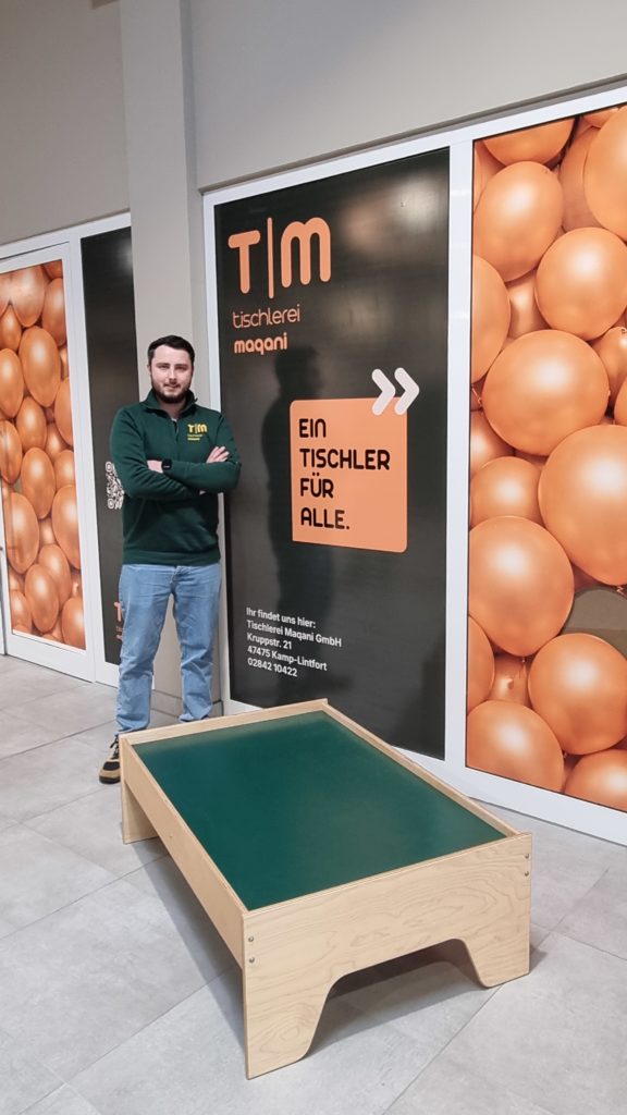 Im Zuge der Aktion hat sich das Team der Tischlerei Maqani auch ein Gewinnspiel für Kinder einfallen lassen. Auf Prospektständern vor dem Ausstellungsraum finden Passanten nicht nur die Kontaktdaten der Tischlerei, sondern auch ein Ausmalbild. Mädchen und Jungen sind aufgerufen, die Vorlage mitzunehmen und mit bunten Farben zu gestalten. Anschließend können sie ihr fertiges Bild dort in den vorgesehenen Briefkasten einwerfen. „Unter allen Teilnehmern verlosen wir den hochwertigen Spieltisch, den wir dort ausgestellt haben“, kündigt Jeton Maqani an.