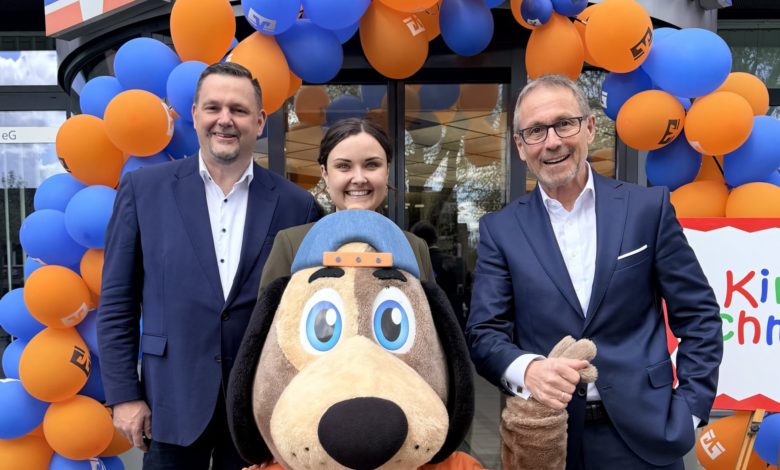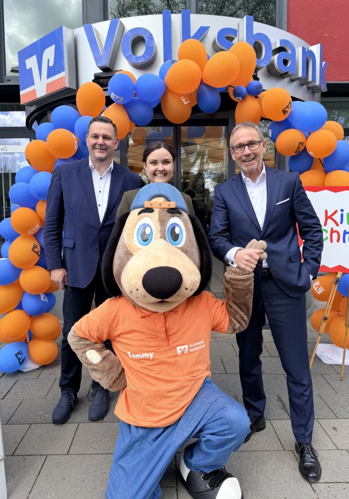 Bildunterschrift: von links nach rechts: Geschäftsstellenleiter Achim Pleines, Privatkundenberaterin Nadja Zorn, Vorstandsvorsitzender Guido Lohmann, vorne Maskottchen Sammy