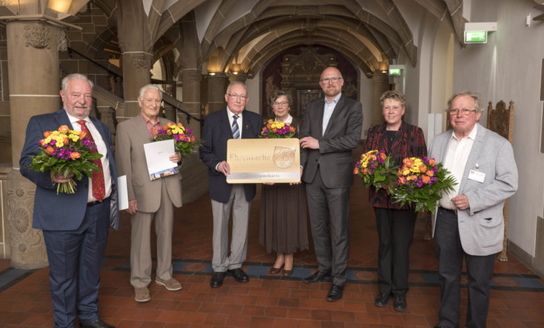 Ehrenamtskarten NRW – v.l.n.r. Horst Salmagne, Kurt Schreiber, Eheleute Gerda und Dietrich Rahm, Oberbürgermeisten Sören Link, Patricia Kerst und Heinz Becker.
