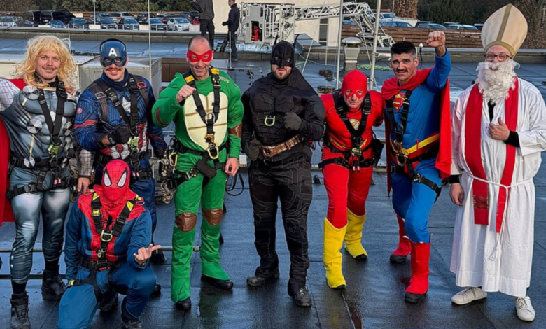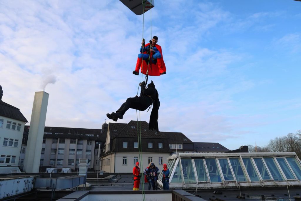 Ab 10 Uhr seilten sich sieben als Superhelden verkleidete Einsatzkräfte – Batman, Superman, Flash, Spiderman, Thor, Raphael und Captain America – spektakulär an der Fassade der Kinderklinik ab und geleiteten den Nikolaus so sicher zu den Kindern. Sie winkten, machten Späße und sorgten für einen Moment, in dem der Krankenhausalltag für die kleinen Patientinnen und Patienten völlig in den Hintergrund rückte. Der Nikolaus besuchte im Anschluss die Kinder persönlich und überreichte kleine Geschenke – liebevoll vorbereitet und gespendet vom Förderverein Ellis Freunde e. V., der die Aktion jährlich unterstützt.
