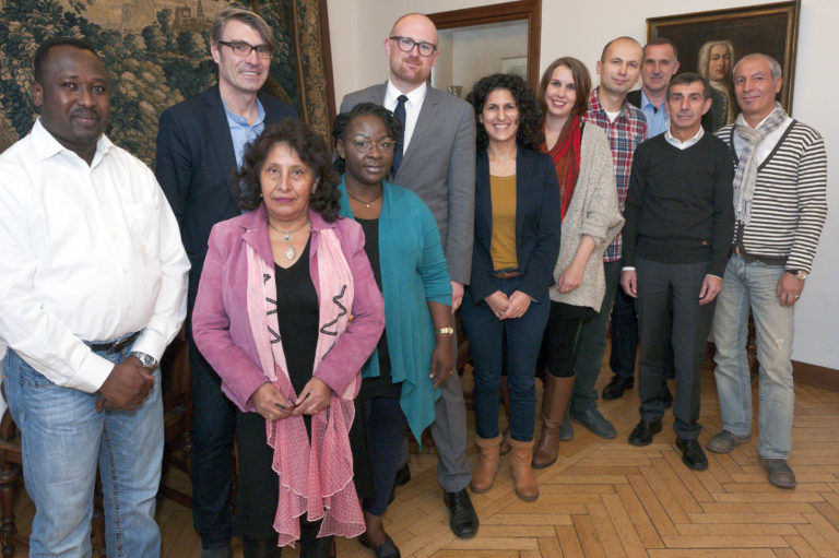 Foto vom Tag des Dialogs mit OB Sören Link im Mercatorzimmer des Duisburger Rathauses. (von links nach rechts) Amadou Nassamou, Mario Tersic, Irena Stabel, Marthe Ngomba-Matanda, Sören Link, Rusen Tayfur, Stella Rauscher, Herr Saljunovic, Klaus Stephan, Herr Kriakidis, Mustafa Cebe