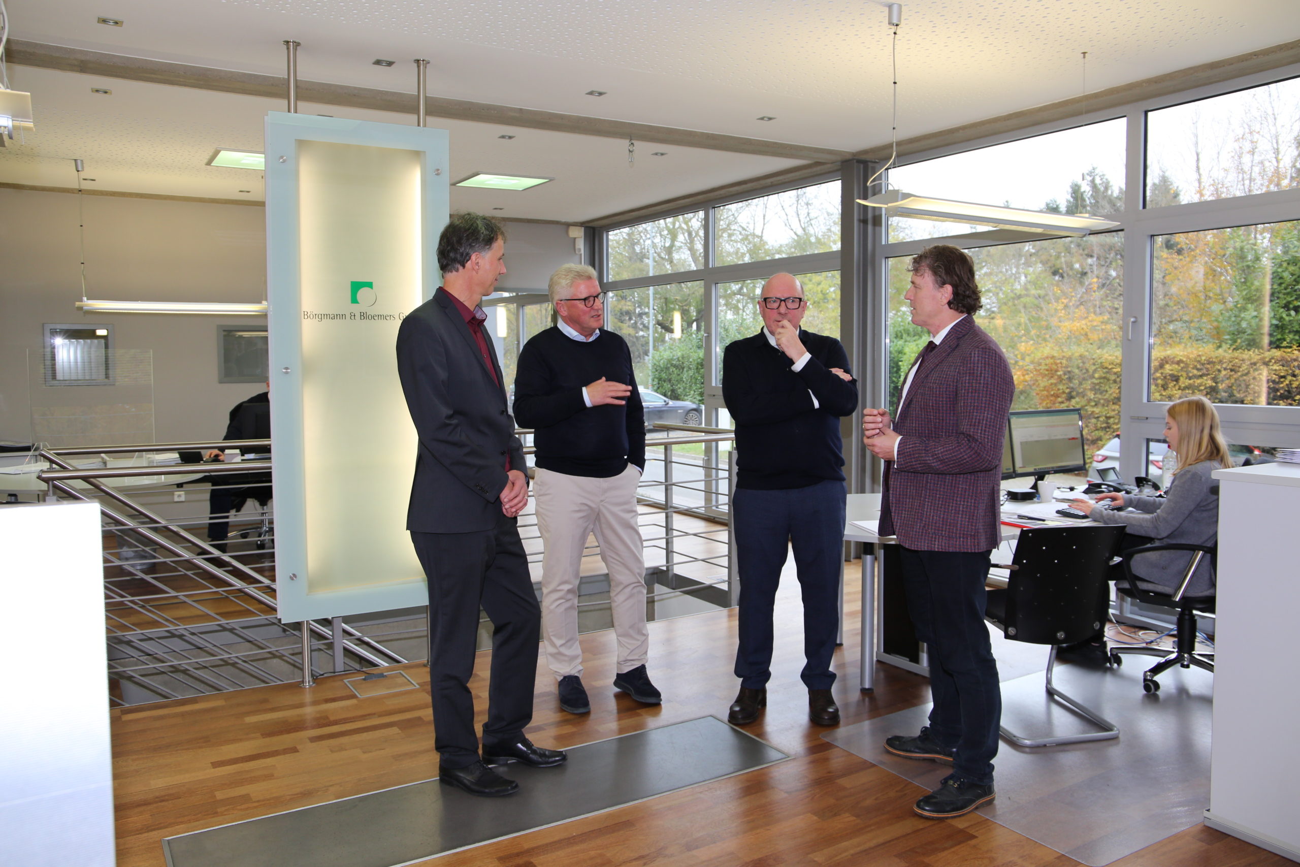 Bildzeile: Die Geschäftsführer Ralf Bloemers (2. v. l.) und Jochen Börgmann (2. v. r.) präsentieren Bürgermeister Christoph Fleischhauer (r.) und Wirtschaftsförderer Jens Heidenreich ihr Unternehmen. (Foto: pst)